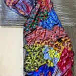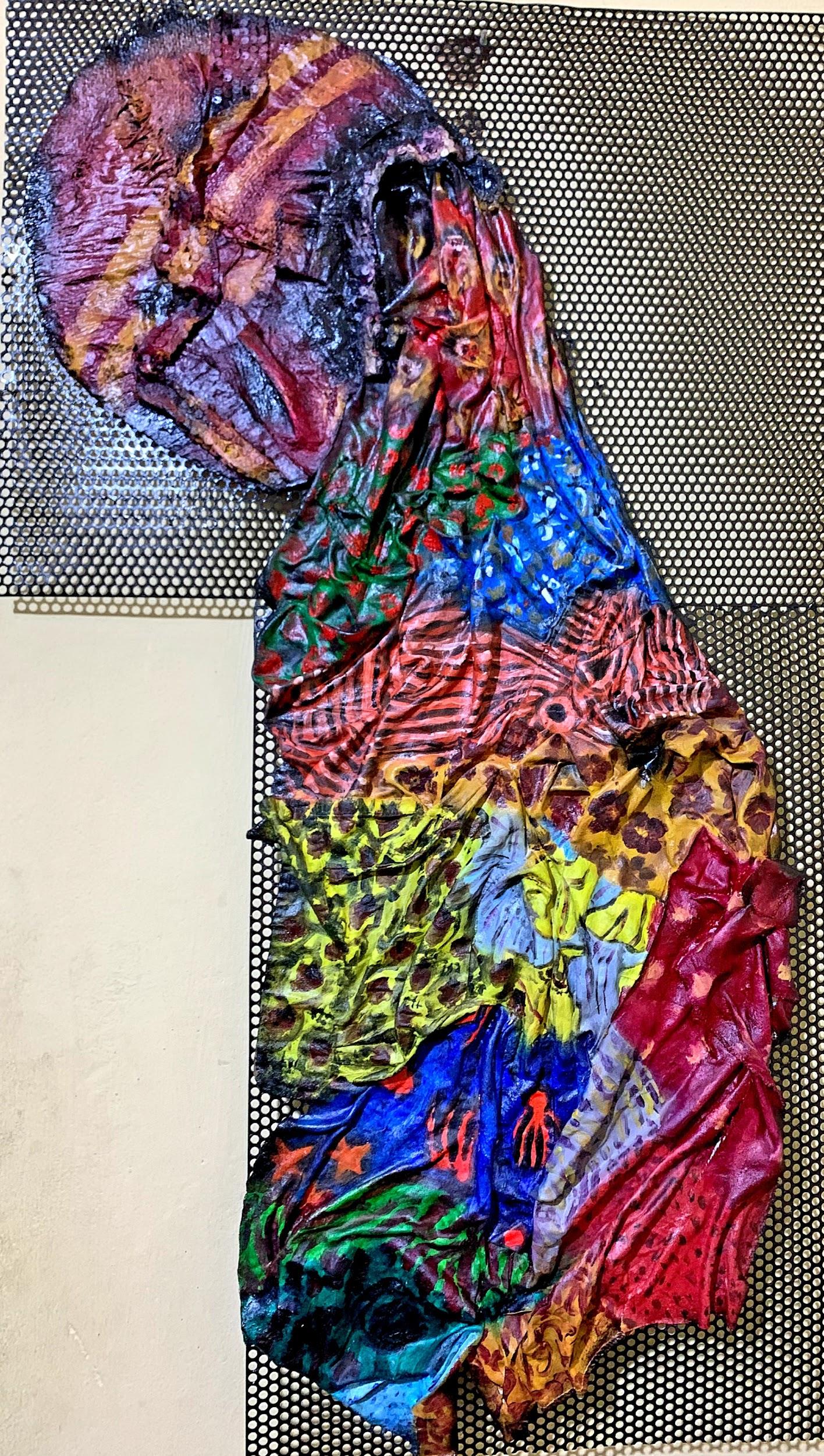 of patterned cloth. On closer inspection it is a layered archive: fragments of textiles, paint, and