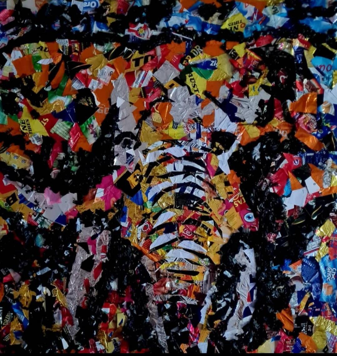 This artwork transforms recycled waste into the form of an elephant, a striking symbol of strength, memory, and survival. By reshaping discarded materials into one of nature’s most majestic creatures, the artist challenges us to reconsider what we throw away and how it impacts the world we live in. The elephant, often seen as a guardian of the earth, becomes here a vessel of renewal. The waste that once polluted landfills and streets has been reborn into art, proving that even what is rejected can carry dignity, purpose, and beauty.